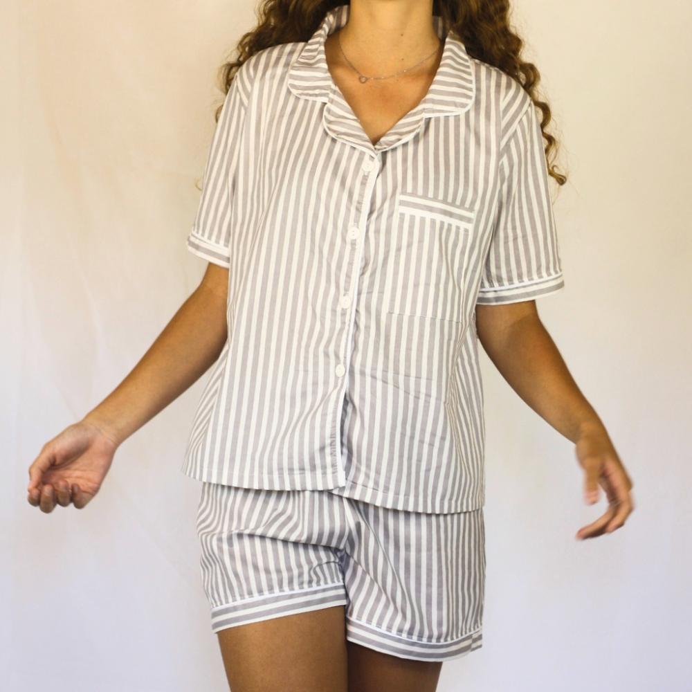Blusa em tecido de tricoline 100% algodão no estilo Américano com botões funcionais listras média cinza