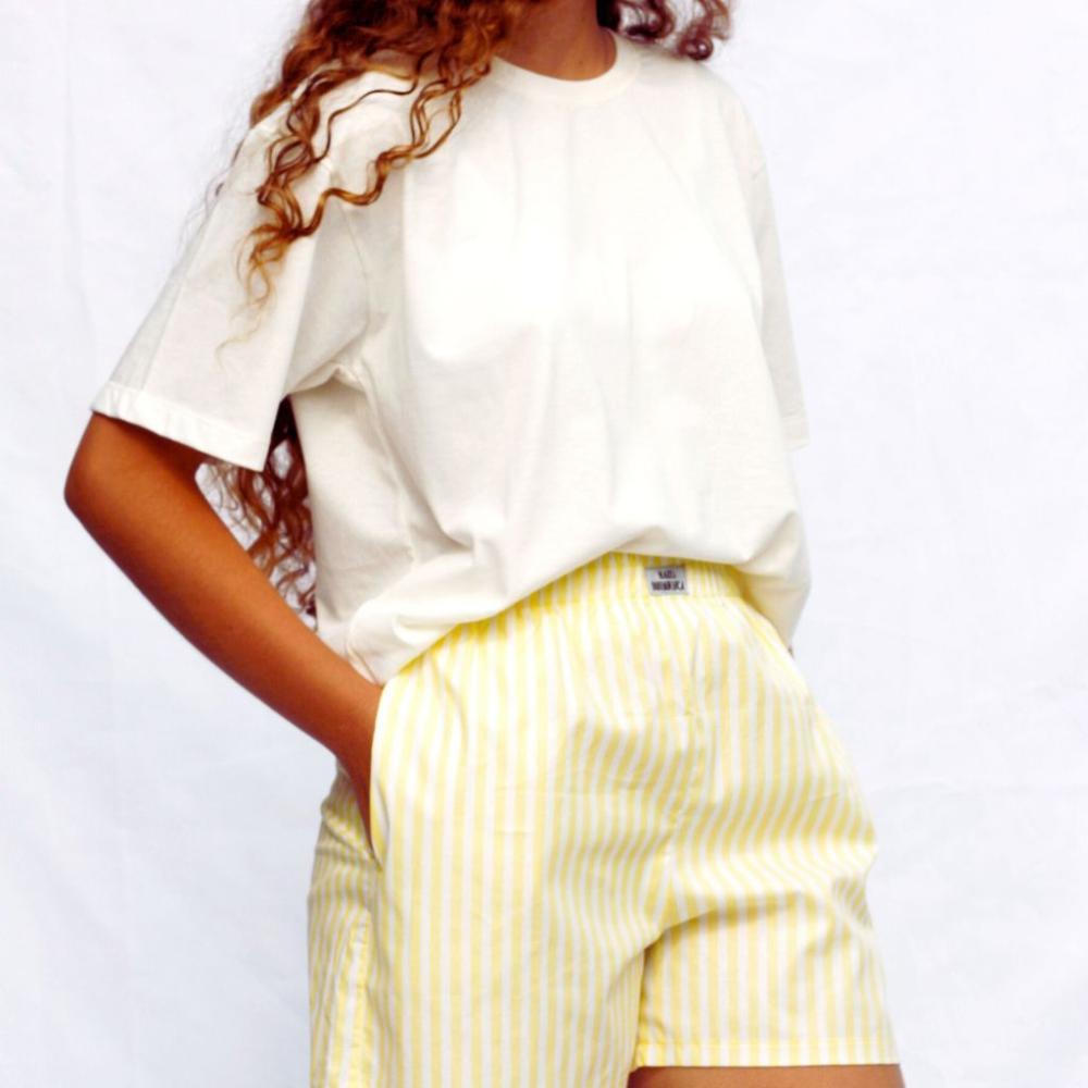 Short em tecido de tricoline 100% algodão listras média amarelo