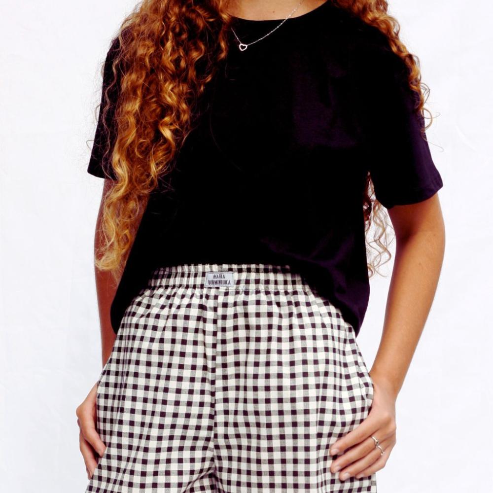 Short xadrez Vichy preto em tecido de tricoline 100% algodão