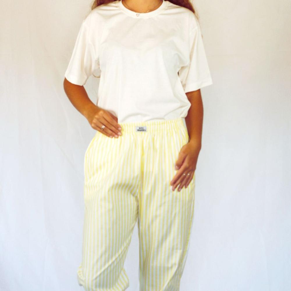 Calça em tecido de tricoline 100% algodão listra média amarela